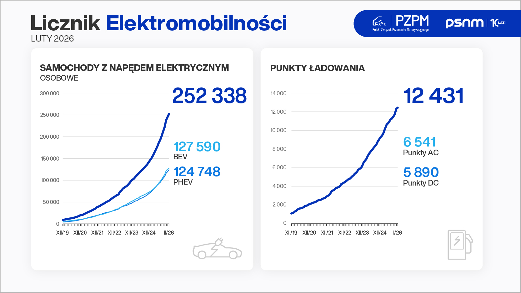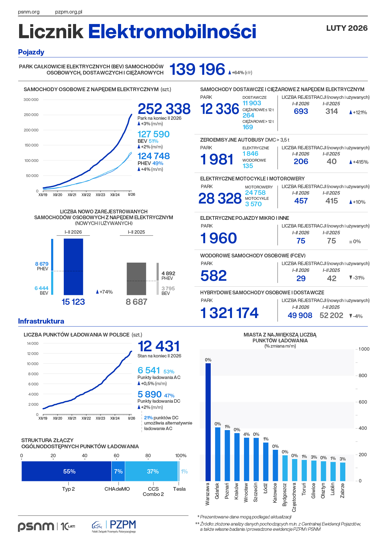 Pod koniec lutego 2026 r. po polskich drogach jeździło 252 338 samochodów osobowych z napędem elektrycznym. Flota w pełni elektrycznych, osobowych aut (BEV, ang. battery electric vehicles) liczyła 127 590 szt., a park hybryd typu plug-in (PHEV, ang. plug-in hybrid electric vehicles) – 124 748 szt. Liczba samochodów dostawczych i ciężarowych z napędem elektrycznym wynosiła 12 336 szt. Stale rośnie flota elektrycznych motorowerów i motocykli, która na koniec lutego składała się z 28 328 szt., jak również liczba osobowych i dostawczych aut hybrydowych, która powiększyła się do 1 321 174 szt. Pod koniec ubiegłego miesiąca park autobusów zeroemisyjnych w Polsce wzrósł do 1 981 szt. (z czego pojazdy całkowicie elektryczne stanowiły 1 846 szt., zaś wodorowe 135 szt.).